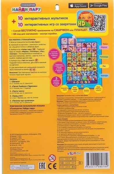 Детский планшет "Найди пару" представляет собой озвученную обучающую игрушку для малышей. Это красочный и веселый планшетик, который познакомит ребенка с животными зоопарка, леса и фермы. Ребенок узнает, чем каждое из них питается и какое имеет значение для природы и фермерского хозяйства человека. Ребенку предлагается найти животному пару, распознать их голоса и звуки, которые они издают. Также на данном планшете есть песенки из известных мультфильмов, которые развлекут ребенка.