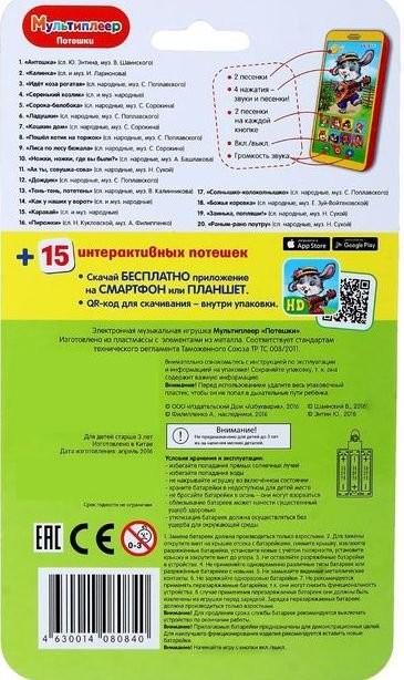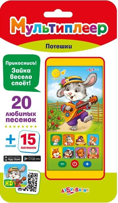 Детский мультиплеер "Потешки" - продукт одного из ведущих российских издательств - компании Азбукварик, которая разрабатывает и выпускает множество развлекательных и развивающих товаров и книг для детей. Игрушка проиграет ребенку весёлые потешки. Нажав на изображение зайца, ребёнок услышит, как зайка споёт ему песенку. Каждая кнопочка игрушки, расположенная в нижней части, воспроизводит по две песни. Всего мультиплеер содержит 20 различных песенок-потешек. Но ребенок может пополнить трек-лист, скачав еще пятнадцать потешек в App Store или Play Market. Вашему ребенку безусловно понравился такая игрушка, ведь плеер похож на настоящий и его всегда удобно взять с собой благодаря компактным размерам.