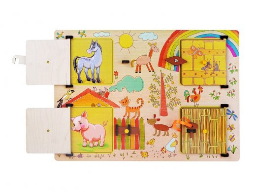 Бизиборд "Ферма магнитики" заинтересует многих малышей. Каждый ребенок будет с радостью играть с такой необычной доской, на которой размещены различные замочки, щеколды и дверцы. Доска представляет собой небольшую ферму, где можно увидеть рисованных животных и дверцы в их загоны.