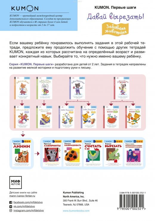 Рабочие тетради KUMON для дошкольников помогут вашему ребенку приобрести навыки письма, счета, а также научат его работать с ножницами и клеем. Задания, разработанные по методике KUMON: Тренируют внимание и усидчивость. Воспитывают самодисциплину и привычку к самостоятельным занятиям. Помогают ребенку почувствовать уверенность в своих силах. Метод KUMON основан на многократном выполнении однотипных заданий, которые, постепенно усложняясь, позволяют ребенку без труда освоить и закрепить приобретенные навыки. Двигаясь вперед небольшими шажками, ваш ребенок, несомненно, добьется успеха в освоении предлагаемого учебного материала.