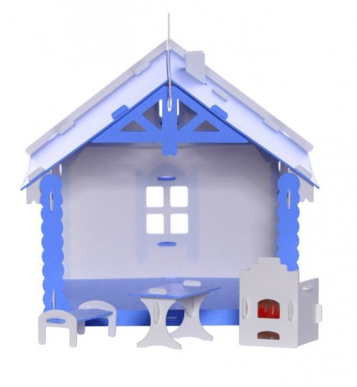 Как и положено, над домиком усердно поработал мастер, украсив его крышу резным коньком, нарядив наличниками окна и добавив по углам домика красивую резьбу. Разве может быть такой домик без печки?! Конечно нет! Печка, стол и скамейка входят в набор.