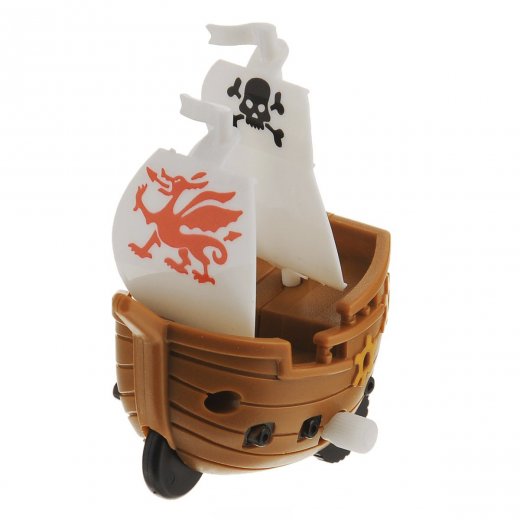 Заводная игрушка Корабль привлечет внимание вашего малыша и не позволит ему скучать! Выполненная из безопасного пластика, игрушка представляет собой пиратский корабль. Игрушка имеет механический завод. Для запуска, придерживая колеса, поверните заводной ключ по часовой стрелке до упора. Установите игрушку на поверхность и она поедет вперед.