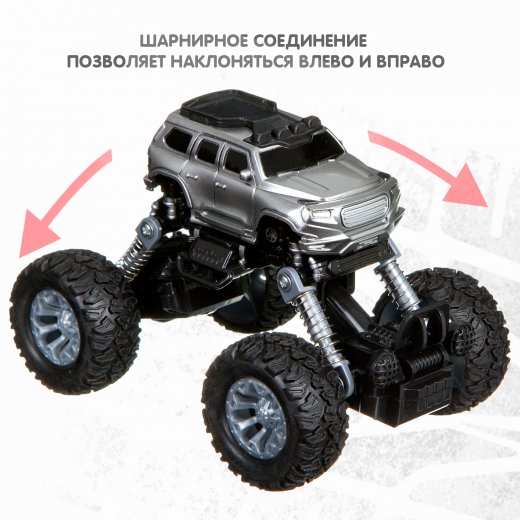 Уменьшенная модель настоящего внедорожника-вездехода отличается оригинальным дизайном кузова и инерционным ( pull back) механизмом 4-х колес.