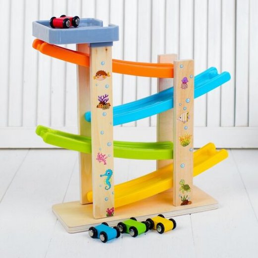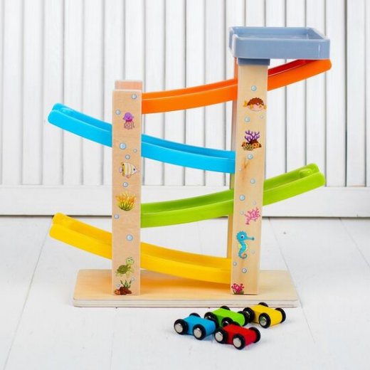 Что может быть интереснее гонок? Только очень быстрые гонки! Ребенок с удовольствием будет спускать машинки с горки. Мини-автомобили можно скатывать по одному или все разом – ребенок будет увлеченно наблюдать за движением машинок и научится улавливать причинно-следственные связи. Установить машину на верхнем уровне необходимо ровно, иначе она не съедет вниз! Это требует сноровки маленьких пальчиков. Можно играть и без горки, катая автомобильчики где захочется!