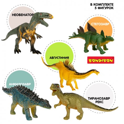 В комплекте 5 фигурок – Неовенатор, Стегозавр, Августиния, Тиранозавр Рекс, Анкилозавр.