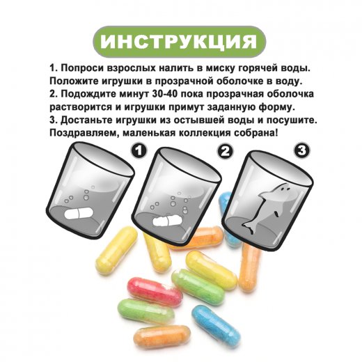 Наливаете миску горячей воды, кладете игрушки в оболочке в воду, ждете 30-40 минут, пока капсула растворится и примет нужную форму, достаете игрушку и сушите ее. Готово!