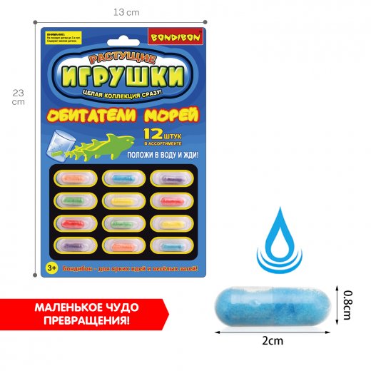 Маленькое чудо превращения прямо у Вас дома – осталось просто добавить воды, а набор растущих в воде игрушек "Обитатели морей" 12 капсул Bondibon все сделает сам.