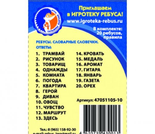 Комплектация: 20 карточек, правила разгадывания ребусов, ответы.