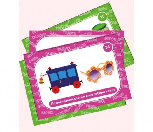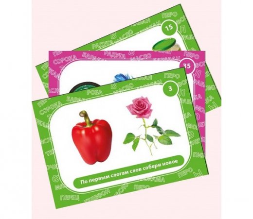 18 двухсторонних карточек с ребусами, входящие в комплект "Слова и слоги", помогут ребятам научиться делить слова на слоги, складывать слова из слогов и выделять ударные слоги.
