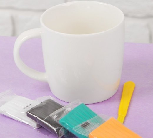 Состав набора: кружка, стека, полимерная глина, трафарет.