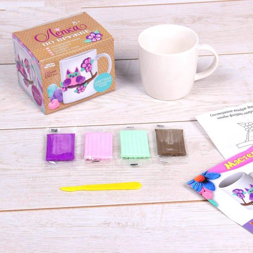 Состав набора: кружка, стека, трафарет, 4 пакетика с полимерной глиной.