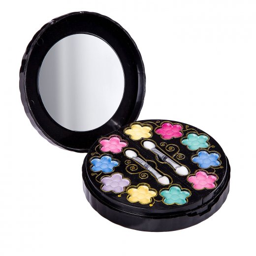 Состав набора: двухуровневая косметичка-круг с зеркальцем, тени для век, румяна, блеск для губ, помада, три аппликатора, одна кисточка-растушевка, два лака для ногтей.