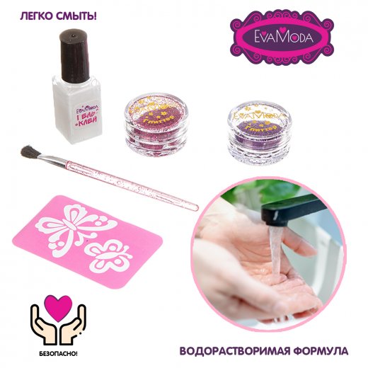 В комплекте: 2 набора блёсток, специальный безопасный клей для их нанесения на кожу, трафареты с рисунком.
