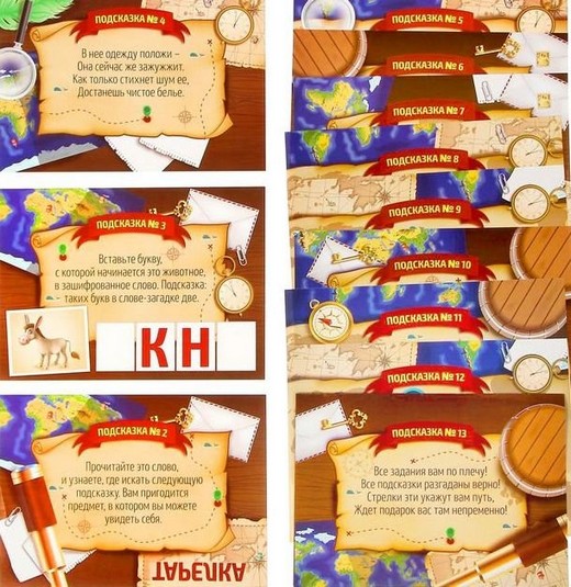 Всё, что нужно — это правильно положить подсказки. Разместите их в книгах, в обуви, спрячьте за часами и в других местах вашей квартиры. Следуйте правилам, и у вас всё получится! Кладоискателей ждут ребусы, загадки, шифры и другие интересные задания.