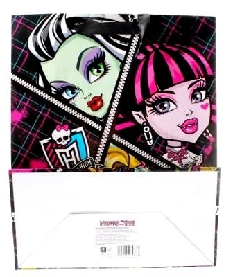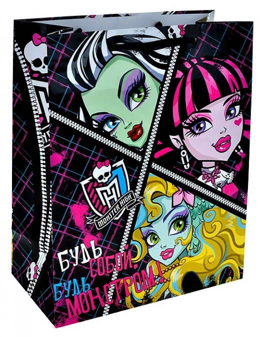 Бумажные ламинированные пакеты - лидеры по популярности среди подарочной упаковки. Выполнен он в мягких и красочных тонах, с изображением героев из популярного мультфильма «Монстр Хай». Такой пакет несомненно понравится получателю. Благодаря качественной печати рисунок не сотрётся и не выгорит и к тому же он достаточно прочен, способен выдержать до 10 килограммов. Так что в дальнейшем его владелец может пользоваться им по прямому назначению, для походов в магазин и т.д.