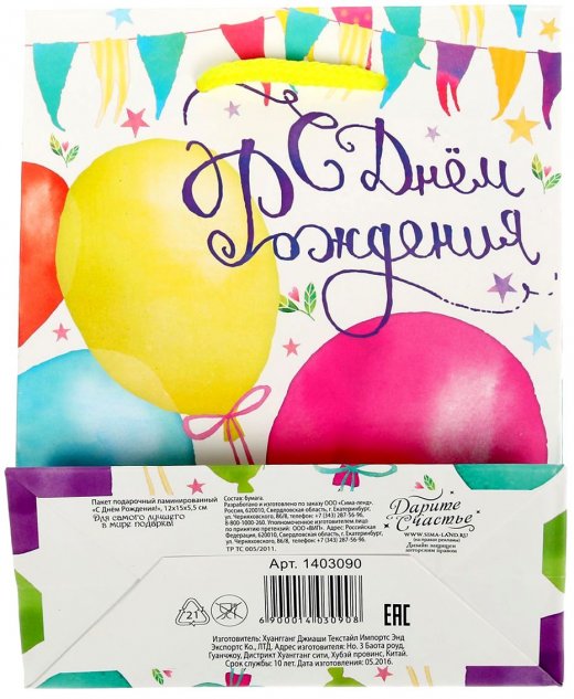 Ламинированные бумажные пакеты — лидеры по популярности среди подарочной упаковки. Выполнен он в ярких и красочных тонах с изображением воздушных шаров, а благодаря качественной печати рисунок не сотрётся и не выгорит и к тому же он достаточно прочен. Так что в дальнейшем его владелец может пользоваться им по прямому назначению, для походов в магазин и т.д.