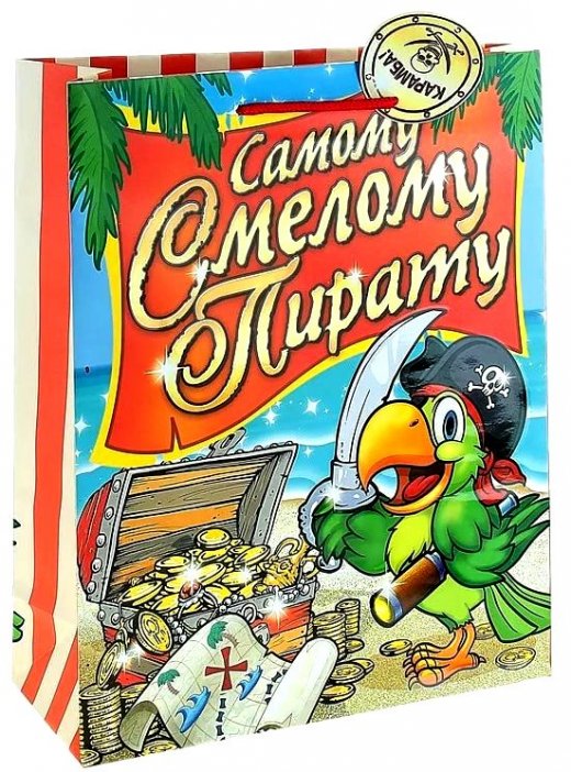 Подарочный пакет Смелому пирату - можно использовать как небольшой презент или как красивую упаковку под непосредственный подарок. Выполнен он в ярких и насыщенных тонах, с изображением знаменитого попугая капитана флинта, одноногого пирата, грозы морей. Такой пакет непременно понравится ребенку.