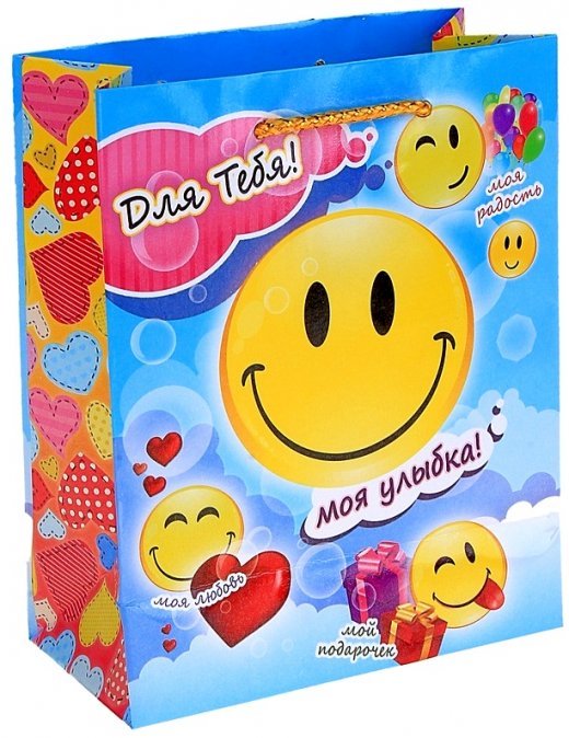 Подарочный пакет Моя улыбка – можно использовать как небольшой презент или как красивую упаковку под непосредственный подарок. Ламинированные бумажные пакеты — лидеры по популярности среди подарочной упаковки. Подарки не обязательно делать только по важным поводам. Дарите их спонтанно, без причины, просто для души. Ведь главное в этом процессе — удовольствие! А сколько радости получит адресат, когда увидит такой красочный пакет с веселыми смайликами! Пакет без сомнений понравится ребенку и поднимет ему настроение! Прочная ламинированная бумага с атласными ручками и уникальный дизайн делают его идеальным. Положите в него конфеты или игрушки, и ваш подарок не затеряется среди других.