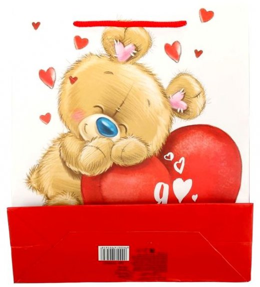 Бумажные пакеты — лидеры по популярности среди подарочной упаковки. Пакет очень яркий и красочный с изображением милого влюбленного мишки, он несомненно понравится девушке. Благодаря качественной печати рисунок не сотрётся и не выгорит и к тому же он достаточно прочен, способен выдержать до 10 килограмм.