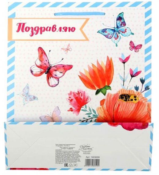Ламинированные бумажные пакеты — лидеры по популярности среди подарочной упаковки. Выполнен он в ярких и красочных тонах, с изображением милых цветов и бабочек, которые несомненно понравятся прекрасной половине человечества. Благодаря качественной печати рисунок не сотрётся и не выгорит и к тому же он достаточно прочен, способен выдержать до 10 килограмм. Так что в дальнейшем его владелец может пользоваться им по прямому назначению, для походов в магазин и т.д.