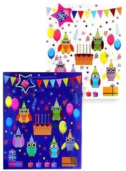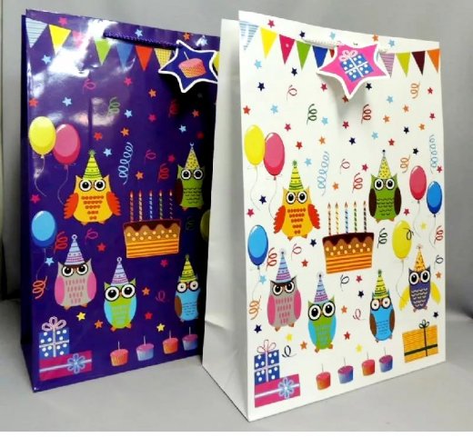 Бумажные ламинированные пакеты — лидеры по популярности среди подарочной упаковки. Выполнен он в ярких и красочных тонах, с изображением симпатичных сов в веселых и ярких тонах, которые несомненно понравятся адресату. Благодаря качественной печати рисунок не сотрётся и не выгорит и к тому же он достаточно прочен, способен выдержать до 10 килограмм. Так что в дальнейшем его владелец может пользоваться им по прямому назначению, для походов в магазин и т.д.