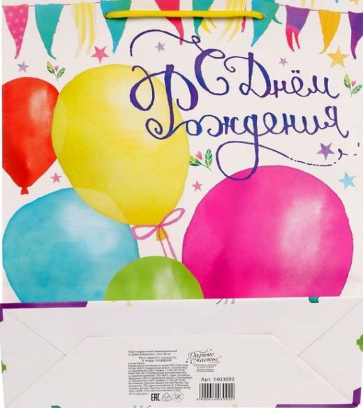 Ламинированные бумажные пакеты — лидеры по популярности среди подарочной упаковки. Выполнен он в ярких и красочных тонах, с изображением воздушных шаров. Благодаря качественной печати рисунок не сотрётся и не выгорит и к тому же он достаточно прочен. Так что в дальнейшем его владелец может пользоваться им по прямому назначению, для походов в магазин и т.д.