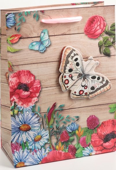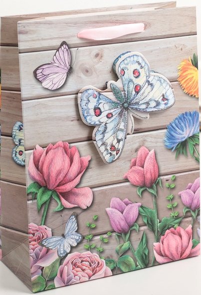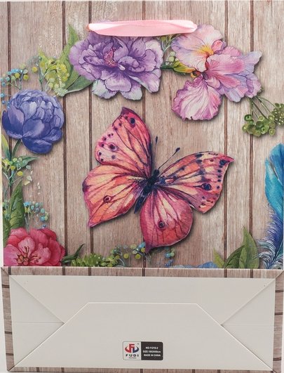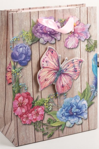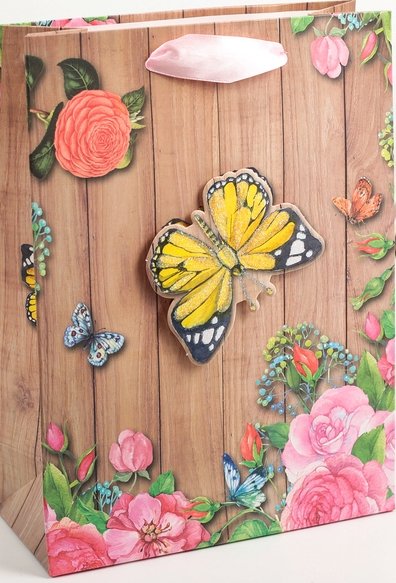 Ламинированные бумажные пакеты — лидеры по популярности среди подарочной упаковки. Выполнен он в ярких и красочных тонах с изображением бабочек, а благодаря качественной печати рисунок не сотрётся и не выгорит и к тому же он достаточно прочен. Так что в дальнейшем его владелец может пользоваться им по прямому назначению, для походов в магазин и т.д.