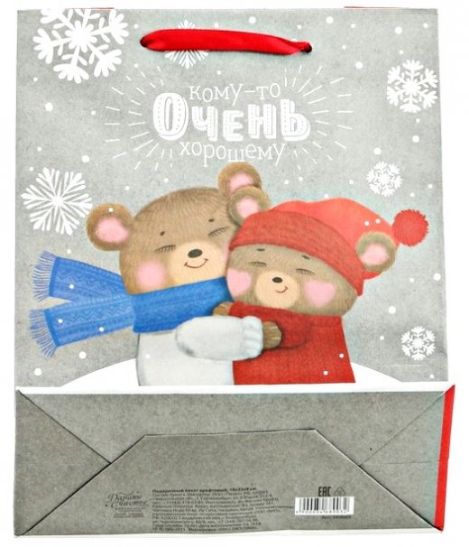 Подарочный пакет имеет оригинальный дизайн и новогоднее настроение, на нем изображены веселые новогодние мишки в обнимку. Нн обязательно понравится получателю! Изделие выполнено из плотной бумаги, благодаря чему обеспечит надёжную защиту содержимого. Подарки не обязательно делать только по важным поводам. Дарите их спонтанно, без причины, просто для души, ведь главное в этом процессе — удовольствие. Положите в него конфеты или игрушки, и ваш подарок не затеряется среди других.