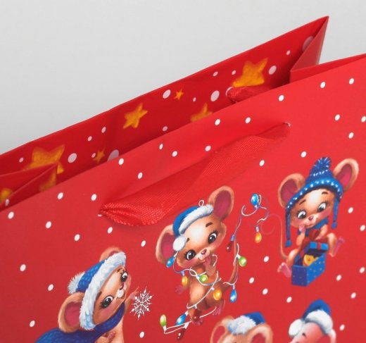 Пакет подарочный Мышки - послужит как небольшой презент или как красивая упаковка под непосредственный подарок. Любой подарок начинается с упаковки. Что может быть трогательнее и волшебнее, чем ритуал разворачивания полученного презента. И именно оригинальная, со вкусом выбранная упаковка выделит ваш подарок из массы других.