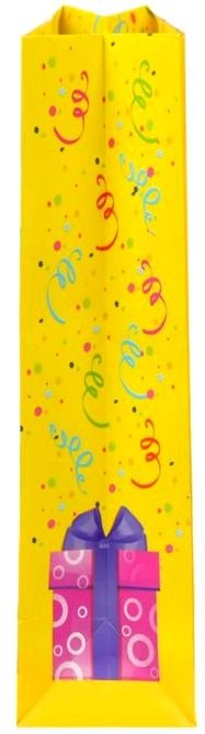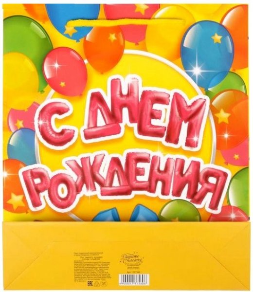 Ламинированные бумажные пакеты — лидеры по популярности среди подарочной упаковки. Выполнен он в ярких и красочных тонах, с изображением воздушных шаров и подарков. Благодаря качественной печати рисунок не сотрётся и не выгорит и к тому же он достаточно прочен, способен выдержать до 10 килограмм. Так что в дальнейшем его владелец может пользоваться им по прямому назначению, для походов в магазин и т.д.