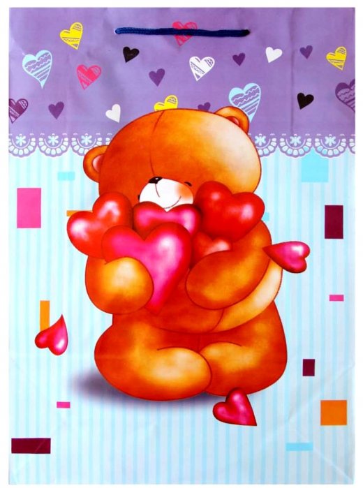Пакет бумажный Медвежонок с сердечком – можно использовать как небольшой презент или как красивую упаковку под непосредственный подарок. Бумажные пакеты — лидеры по популярности среди подарочной упаковки. Выполнен он в ярких и красочных тонах, с изображением милого мишки и сердечками, такой красочный пакет подарит адресату праздничное настроение.