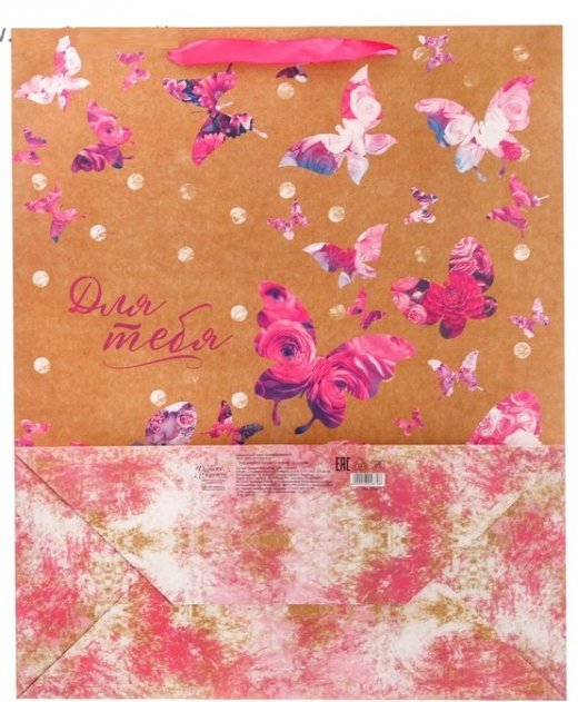 Бумажные пакеты — лидеры по популярности среди подарочной упаковки. Выполнен он в ярких и красочных тонах с изображением прекрасных бабочек и оригинальной надписи, а благодаря качественной печати рисунок не сотрётся и не выгорит и к тому же он достаточно прочен. Так что в дальнейшем его владелец может пользоваться им по прямому назначению, для походов в магазин и т.д.