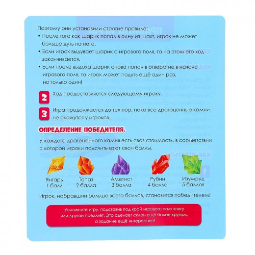Первый игрок дует на шарик так, чтобы он оказался в одной из шахт. Как только он в отверстии — участник забирает себе драгоценный камень соответствующего цвета.
