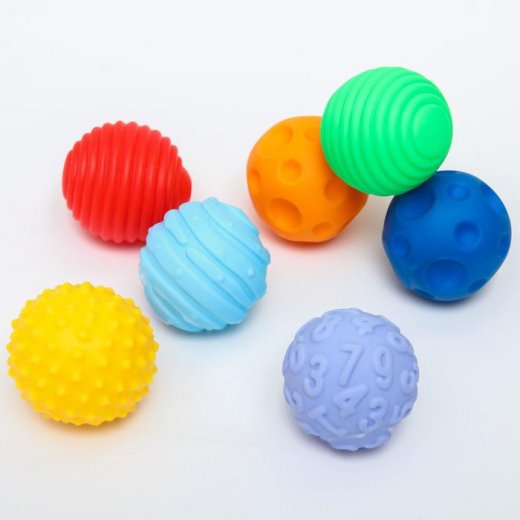 Мячики с рельефной массажной поверхностью способствуют развитию мелкой моторики и тактильных ощущений. Давление на фактурную поверхность мячиков стимулирует и благоприятно воздействует на нервные окончания, ответственные за большинство процессов в организме. Шарики имеют яркие цвета, которые способствуют развитию зрения, а пищалка внутри развивает слуховое восприятие.