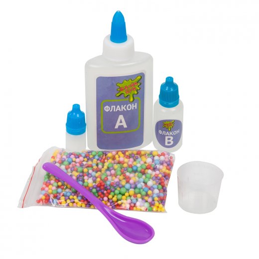 Состав набора: основной раствор А, контактный раствор В, краситель 1 шт., пенопластовые шарики, ложка, стаканчик, инструкция.