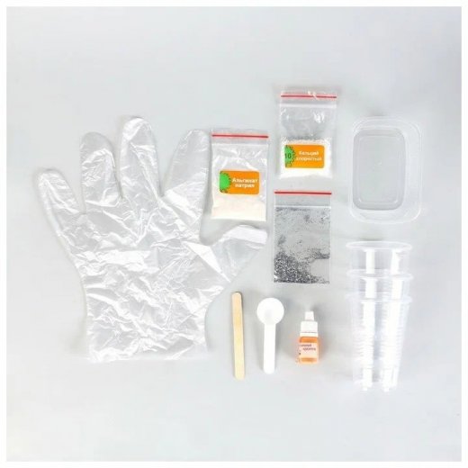 В наборе: альгинат натрия-1шт, хлорид кальция-1шт, пишевой краситель-1шт, глиттер-1шт, стакан одноразовый-3шт, контейнер пластиковый-1шт, ложка мерная-1шт, палочка для размешивания-1шт, перчатки.