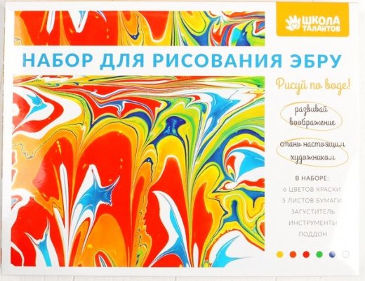 Состав набора: 6 красок, 5 листов бумаги, загуститель, инструменты, поддон.