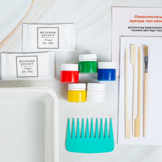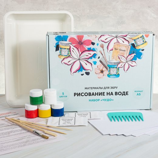 Набор "Эбру-Чудо" имеет полноценный состав и его хватит для того, чтобы увидеть свое маленькое чудо в технике рисования на воде и научиться простым основам Эбру. Формат ванночки - А5