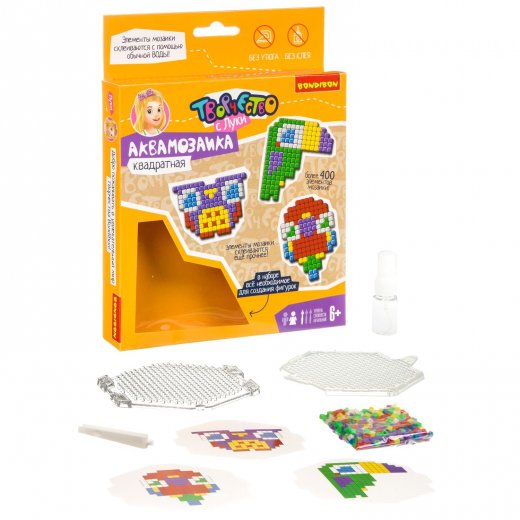 Всё, что нужно для этого - собрать бусины на основе-планшете и сбрызнуть водой из флакончика в наборе. Через некоторое время детали соединятся и фигурку можно снимать с планшета. Отличительная черта этого набора - квадратные детали мозаики. Это не только дарит изделиям модный пиксельный дизайн, но и увеличивает площадь соприкосновения деталей, за счет чего они скрепляются между собой еще прочнее.
