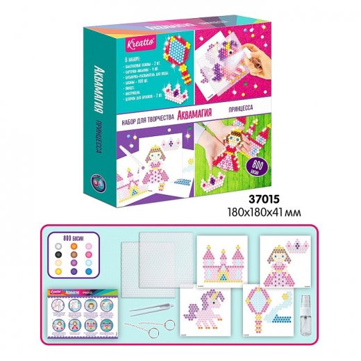 Набор для творчества Аквамагия Принцессы представляет собой модную мозаику, соединительным элементом в которой является вода. Экспериментируя с комбинациями бусин, а также, используя специальные шаблоны, ребенок самостоятельно изготовит миниатюрные игрушки. В данном комплекте ему предлагается изготовить фигурки в виде: принцессы, замка, зеркала, пони, короны и туфельки. Из фигурок можно сделать брелоки, закрепив специальные цепочки между бусин перед распылением воды.