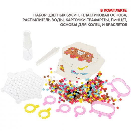 Состав набора: 350 цветных бусин, пластиковая основа для сборки, распылитель воды, карточки-трафареты, пинцет, 5 основ для колец, 2 основы для браслетов.