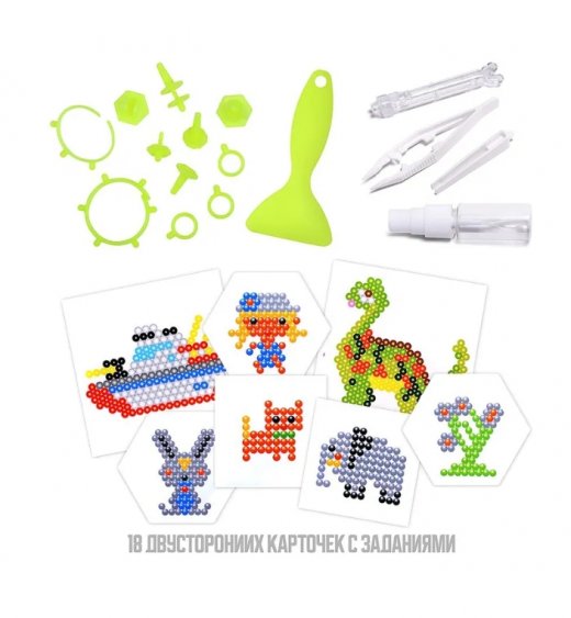 В набор входит:- бокс для бусин.- пластиковая основа 8 шт.- цветные бусины 2400 шт (24 цвета).- распылитель для воды 1 шт.- пинцет 2 шт.- ручка для бусин.- подвес.- кольцо 8 шт. Материал: полимерные материалы, картон. Соответствует требованиям безопасности продукции. Для детей от 6 лет.