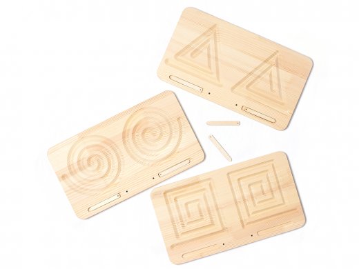 Покажите непоседе, как работать с набором. Для начала предложите взять указки и провести ими по "лабиринтам" на дощечках. Обе руки должны "рисовать" одновременно в противоположных направлениях. При этом вместо палочек можно использовать собственные пальчики.