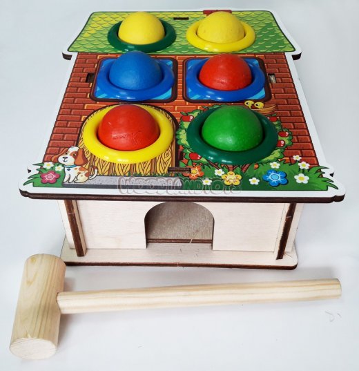 Стучалка "Дом 6 отверстий" - представляет из себя деревянную коробочку в форме домика с 6 отверстиями, в которые вставляются разноцветные шарики по соответствующим цветам. Затем малыш бьет по шарикам молоточком и они падают через отверстия вниз. Из коробочки шарики можно легко достать через большое отверстия сбоку.