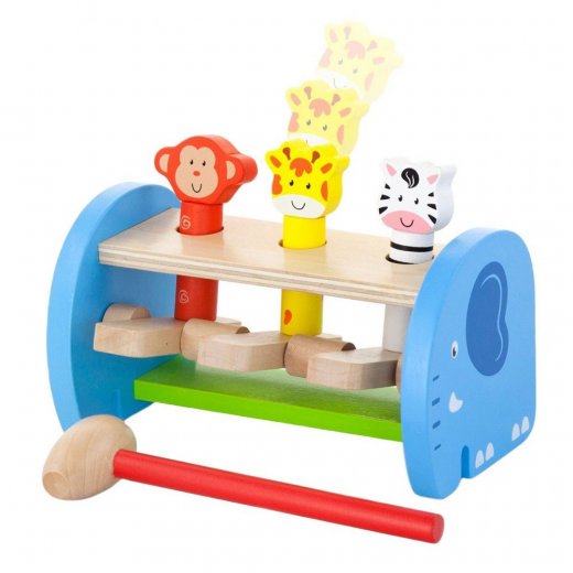 Игра "Стучалка-забивалка Viga" представляет собой деревянный ящичек с тремя клавишами и отверстиями. В каждое отверстие вставляется фигурка животного. Задача ребенка - стучать по клавишам молотком так, чтобы фигурки "выпрыгивали" из отверстий.