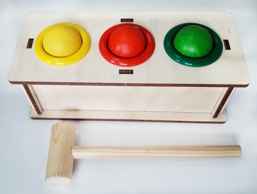 "Стучалка деревянная, 3 отверстия" представляет собой прямоугольный объёмный деревянный корпус с цветными пластиковыми отверстиями-сортировщиками, пластиковые шарики и деревянный молоточек. Задача ребенка – раскладывать в отверстия по цвету шарики, воздействовать на них рукой или молоточком и ловить, когда они выкатываются из специального бокового отверстия.