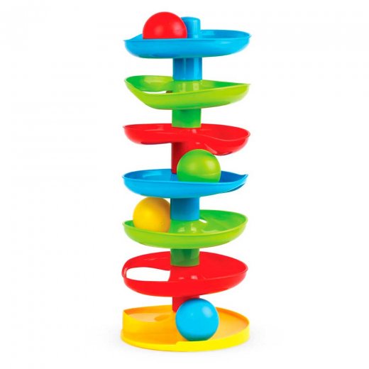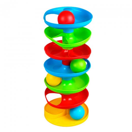 В комплект входят: 7 деталей пирамидки и 4 шарика. Высота башни составляет 37 см.