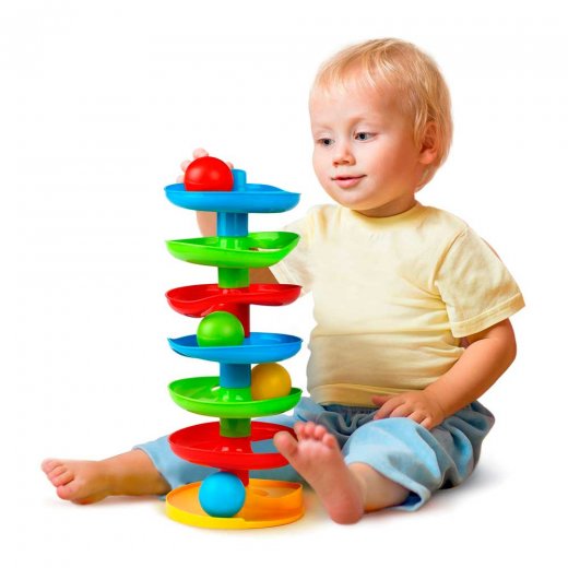 Развивающая игрушка «Башня» Жирафики собирается по принципу пирамидки: детали-этажи постепенно нанизываются друг на друга. Когда башенка будет полностью собрана, на верхний этаж можно будет поместить шарик, и он станет весело скатываться вниз, к самому основанию. Малыш будет с удовольствием повторять этот эксперимент, развивая таким образом наглядно-действенное мышление.