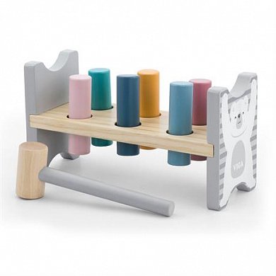 Развивающая игрушка привлекает внимание ребенка приятной расцветкой. Малыш научится удерживать в руках деревянный молоточек, попадать им по колышкам. Это хорошо для укрепления крупной моторики рук. Ребенок будет также исследовать детали набора: гладкое и приятное на ощупь дерево развивает осязание. Еще можно запомнить несколько цветов, в которые окрашены колышки.