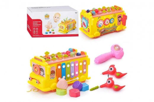 •Сортер. В корпусе автобуса есть разные отверстия. Сортировка предметов по цвету, размеру и форме поможет развитию пространственного мышления.